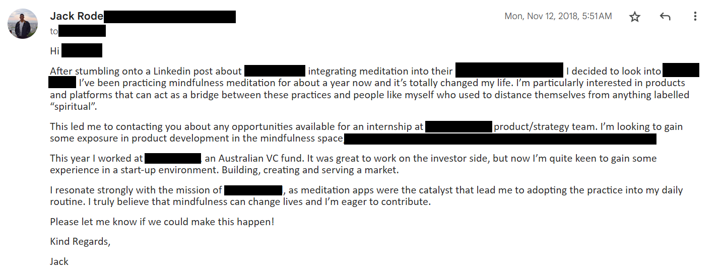 Here’s an actual email I sent a startup in 2018 to land an internship. After months of self inquiry and conversations with startups, my best answer was to help develop products that brought mindfulness practices to the world. There was only one company who was doing it in Melbourne, so I reached out to them and landed the opportunity a week later. It’s worth noting the role wasn’t even advertised, cold outreach increases your surface area for luck.