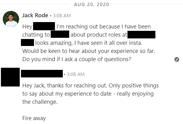 Here I’ve asked whether I could send a few questions via Linkedin first. Often this can lead to a call where you can build more of a relationship and hear more detailed answers. Even if your response rate is only 10%, over 100 days that’s 10 conversations, and you may only need one to land you a role.